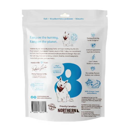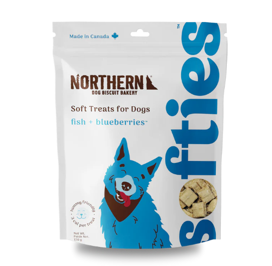 Northern Softies Fish & Blueberries Treats are soft & chewy and sure to be your pup’s new favorite high-value treat. Made with fresh lake fish and Blueberries, this recipe is hypoallergenic and great for dogs with sensitive tummies. These wheat-free dog treats are made with only 8 natural and locally sourced ingredients and have a non-sticky texture that makes them the perfect on-the-go reward for dogs of all ages. Packed with flavour and only 3 calories per treat, Northern Softies are ideal for frequent treating or training.