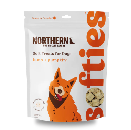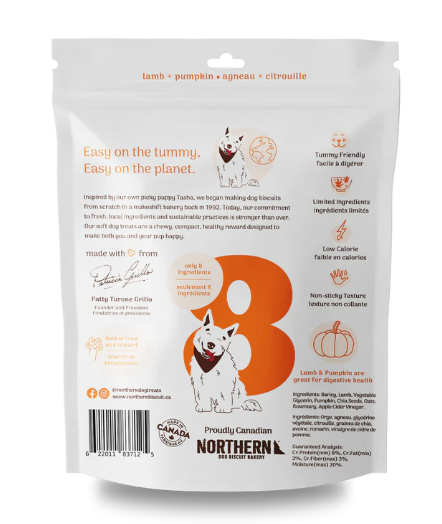 Northern Softies Lamb & Pumpkin Treats are soft & chewy and sure to be your pup’s new favourite high-value treat. Made with fresh lamb and pumpkin, this recipe is hypoallergenic and great for dogs with sensitive tummies. These wheat-free dog treats are made with only 8 natural and locally sourced ingredients and have a non-sticky texture that makes them the perfect on-the-go reward for dogs of all ages. Packed with flavour and only 3 calories per treat, Northern Softies are ideal for frequent treating or training.
