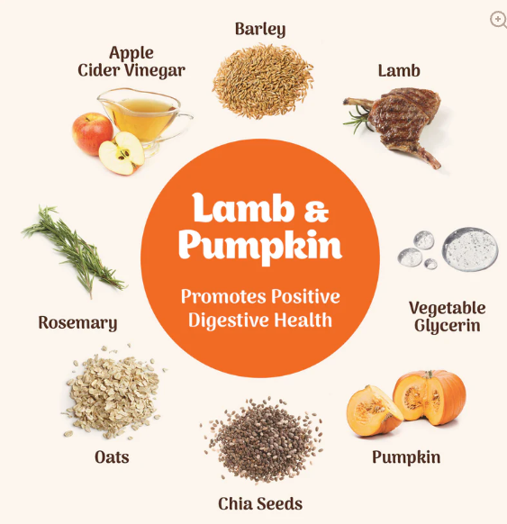 Ingredients: Barley, Lamb, Vegetable Glycerin, Pumpkin, Chia Seeds, Oats, Rosemary, Apple Cider Vinegar.